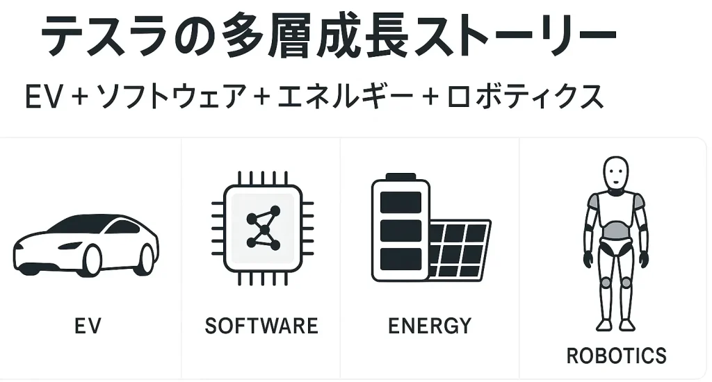TESLAは、EV+ソフトウェア+エネルギー+ロボティクスの多層成長ストーリー。